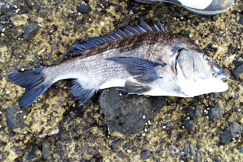 海もおとなしくて釣りやすい状態の中、また大きく竿をしならせたのは見事なクロダイ。 50cm弱であった。 レポート 金田