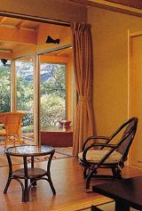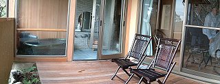 どことなくエスニックが香る部屋、広いウッドデッキで裸のまま森林浴も出来ますよ。