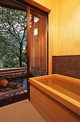 木曽五木のひとつ高野槙で出来た半露店風呂が自慢。槙の香りがとても優しい。