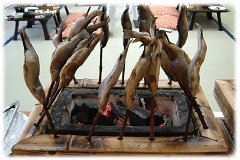 バイキング盛り付け大会、清々しい河原の土手でみんなで握ったオニギリを食べる。 |