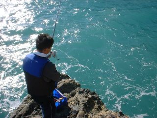 この日、風は強風だったが冬型は急速に移動性高気圧に変わりつつある。それを見越して早朝に磯へ入る。磯はやや強い風だが昨夜の強さではない。サラシの中では流れがわからないので、波しぶきとサラシを避けて潮流を見ると、上り潮がはやい。これは流すしかないと思い、良型メジナ狙いでひたすら流す。が、早朝ではアタリなし。日が昇ってなべちゃんのところへ戻ると、涼しい顔をしているのだが、バッカンにはジャンボイサキが横たわっていた。40cmクラスでよく太っている。ま、お土産重視の彼(笑)にはとっておきの獲物であり、こちらも一安心。