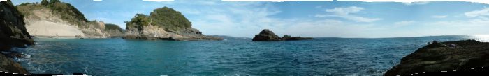 写真は今回の地磯から撮影した8枚の写真をパノラマ処理したもの(約180度)。比較的凪のように見えますが、日中はやや西風が強く、夕間詰めになってから暖かくなってきた。(笑) 12月は異常に寒く真冬以下の低温だっが、やはり今年の初冬は何かおかしい。大気は冷たいのに海水温は20度近い数字で生暖かい。