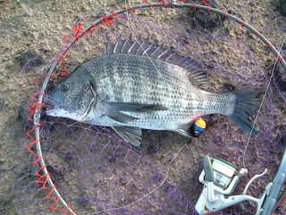 何とか足元まで寄せて浮かせると、今回は黒いクロダイ。(笑) 50cmオーバーのチヌは何枚か上げたことがあるが、