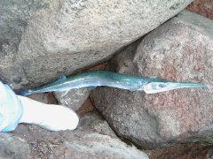 海上へ飛び跳ねた。なにぃ〜?、魚体は確認できなかったが、水中でしっかり泳いでいるであろう事を期待した本人は唖然。デカイのはデカイが何で飛び出しちゃうの?とやや落胆。でも間もなくその魚の正体が判明。ダツである。仕方ないねぇ、でもデカイねぇ、とサッサと抜きに掛かったが失敗。3回目でようやく上げたがこんな太ったダツは見た事がない。