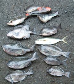 そんなこんなで時間も5時をまわってから、やっとオナガの40cm弱を確保。その前には、渡辺氏が40cmオーバーの立派なイシガキダイを上げている。ここナカノママではこの釣りがおもしろい。楽しめる基本は足元です(笑)。さて続けてサイズアップと期待するも、その後はエビスダイ系の餌取りが多く、風も冷たかったので7時に