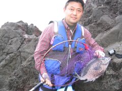 翌日の海は荒れ模様で、4人一緒に地磯へ入る。だがこの日もたいしたアタリはなく、ブダイやハリセンボンが食ってくる程度。そんな中でも昨日同様、渡辺氏一人が気を吐いていた。内容は彼本人から聞いてあげてください。でも歩いても厳しい地磯へ皆さんよく付き合っていただきました。お疲れ様〜。実はこの地磯、我々が帰った後にとても楽しかったようですよ(笑)。 |