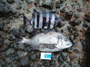 4時頃になって眠くなったので洞窟で1時間仮眠。空がしら〜っとしてきた頃に今度は潮の効いているポイントへ入る。良型メジナも想定して、ウキを潮に乗せて流す。大潮直後の中潮で満潮時も近く、更にウネリも大きく潮も効いている海は、まるで沖磯をしのぐ雰囲気をかもし出している。早朝の大好きなこの雰囲気なのだが、このポイントでの記録はいつも雰囲気だけに終わっているのだ(笑)。ウキ下は約3ヒロ。数回流した後、50m程先でややウキに変化が出る。この時のラインは綺麗に流れに乗っており、自分の立ち位置もウキと流れに比較的直線に対応しており、またゆるい風は流れと逆で理想的。磯の環境の中でこんなベストマッチはそれほどはない。少し張り気味にした瞬間ひったくるように食ってきた。だがまたまた逆転リールのストッパーが効いたままで、竿もラインものされたまま。こんな時の伸びのないPEは辛い。(笑) 瞬間にストッパーを外しなんとかやり取りに入る。でかくてパワーも充分伝わってくる。でもこちらのタックルもパワフル仕様。あとは腕次第か(笑)と弱気にならずしっかりと溜めに入る。竿尻の先はすでに自分より前を向いている。首の振り方で鯛系の雰囲気は充分。あとは色か?と感じていたがあまりにも力が強い。この硬い3号竿がどれだけ曲がるかを試す良いチャンスだが、溜めた後、リールも巻けない程の瞬間もあり、これはいよいよピンク色かな?との予感も。ちょうどその時二人の釣り人が近くに入ってきた。「ここでバラされせへんでぇ、でもあまり見ないで!」とばかり、やや慎重に(笑)寄せようとするが、立場と魚の間にややこしい根が存在する。やはり無理に寄せるよりは持久戦かと思った瞬間、魚は右へ走った。そこは更に複雑なエグレを呈している生え根なのだ。右へ竿を持っていきたいのだが、生え根が気になって竿の勢いが悪い(笑)。ここはポンピングしかないと判断してやや強引になんと |