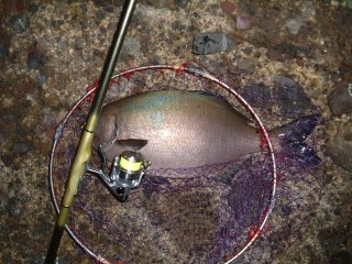 月明かりの中、浮いた魚を凝視すると一瞬「バカデカイクロダイ?」なんて喜びが(笑)、だが渡辺氏にタモを依頼して取っもらうと、デカイ&太い(笑)悠に60cmはあるイスズミであった。いわゆるこの磯のバケモンの一つであろう。さらにその1時間後に竿をひったくるようにもっていった魚は、再び50cmを越えるイスズミ。その時点で非力な私は、休憩に入った(笑)。そして最後に三度の大型らしきをかけるも、今度は針を飲み込まれたらしくチモト切れ。前2枚の針掛かりが、いずれも口に綺麗な掛かりであったことが大きいといえる。夜は出来れば大型針を使うべし。もちろんアワセが大きな問題ですが(笑)。魚はいずれもリリース。ちょっともったいないです(笑)。