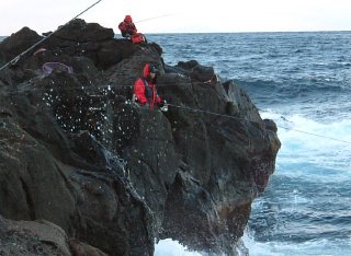 八丈へ着き、アレよコレよとしているうちに、地磯(ヨノモウ)入り口に到着、本気(マジ)で!と、叫びたくなる所を降りていく、多少は風があるものの竿は出せる、先端から萩田さん、金田さん、なべさん、私と入りいざ実釣!この時期なら際に居ると判断し、最初は際から攻めるがアタリが無い、すこしずつ沖目を攻めていくが、一向にアタリの気配もなく、エサも多少かじられるが残ってくる、そんな中、先端の萩田さんはコンスタントに魚をかけている(いいな〜)、だがこちらはアタリがない、みんなを見ながらお食事タイム。 金田さんとお互いに写真を撮りあいながら、なべさんを撮影。 しばらくして金田さんの竿がきれいに曲がり、なべさんがタモ入れに、が!竿を信じてか?ハリスが太いからか、ゴボウ抜き!。気合を入れ直し際を攻めると浮きがゆっくりと入っていく!! 八丈最初の魚は何だ!と思い上げてみたら、タカノハダイ。