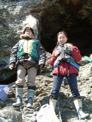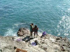 最初の磯は風なし、ポカポカとした陽気で、たたずんでいるだけならうってつけの場所。だが時折東からの大ウネリが仕掛けを全て一箇所へ押しやってしまった。 |