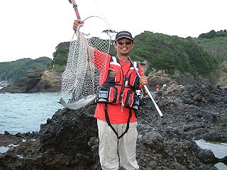 早速、先程確認した場所に移動しやり取りを開始しゲットしたのは大きな口太メジナ。写真を撮ってもらい期待しながら計測してみると目標の40センチに1センチ足りない39センチ、残念!!思いっきりあわせていれば1センチ伸びたかも・・・。と1センチ足りなかったものの前回のサバル杯(6月6日のレポート参照)に続き2回連続で良い思いをしちゃいました。その後の夜釣りは何事もなく過ぎ納竿しました。
