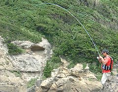 夕方になりまたサバばかり釣れる様になり際を狙ってみる事にする。仕掛けを投入しコマセをウキにかぶせ仕掛けが馴染んだ頃にアタリ。あわせてみるとコッパであるが本命のメジナ。またサバよりはましだろうと同じ際を狙って数投目にアタリ。魚がビックリしないように「そーっと」あわせてみると何かでっかいのがかかった!!