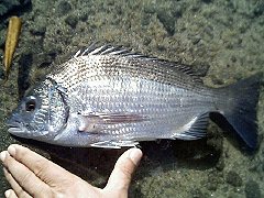 しかしまだ時間は6時、満潮を少し過ぎた頃である。気を取り直した3投目、ウキにチョンチョンとチヌの当たり、やっときた、少しミチ糸の糸ふけをとりながら本あたりを待つ。その時一気にウキが消しこんだ。よしきたゆっくり竿を立てると銀色の竿が弓なりに弧をを描き竿先にはチヌの突っ込む力がビンビンに伝わってくる。少しやり取りしていると力が弱くなり一気に手元まで寄せた海面下にかすかに光ったシルバーの輝き、このたまらない瞬間がやっと訪れた。待望の一発は30cm弱、しばらく磯溜まりに泳がせた後“大きくなって帰っておいで“と声を掛けた後、さらしの中へ。母親の元へ駆け寄るかのように一気に消えていった。