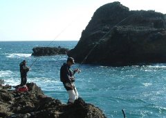 p−side倶楽部のオフ会ということで、1泊2日のスケジユールにて6名が集まった。当日は久々の凪らしい?凪でしたが、初日は魚の活性も高く、6人全員の竿が大きく曲がり、これぞ秋の磯という感じ。^^ 40cm弱のクチブトメジナを始め30cmを超えるクラスも何枚か出て、なんとかこの磯がフグ場からメジナ場へ変わってきた感じがする。とはいっても、相変わらずショウサイは大きく多いのだが、この日一番の功労者はソーダカツオ君ではなかっただろうか。^^
