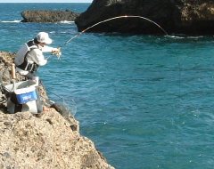 地磯でソーダが回っているという情報は入っていたが、そのことを磯へ一番遅く入った私が、皆に告げた直後から、小魚たちが飛び跳ねてきた。その直後にソーダの隊列が根掛かり師の目の前に^^ ここはソーダで遊ばない手はないと思ったが、真っ先にソーダを掛けたのは、磯釣りが本日が初めての、それも女性であった。このお方、磯釣りとは全く縁のないようなお方なので、HNをビニールさんと命名??^^ そのビニールさんの針をひったくって、3秒持たなかった。竿を立てる間もなく、スプールから道糸がバチバチ・・・・あわせも出来ずに針ハズレで終わってしまった。