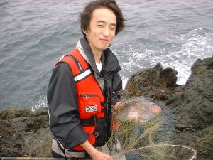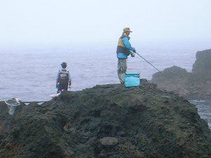今回は「めじな研究所」の「釣り会」へ参加させていただき、久々の渡礁となった。場所は石廊崎のニッチョという磯で、4人が磯釣りを楽しんだ。もちろん本命はメジナの良型であるが、ほとんど動かないような潮で苦戦。当然キタマクラや小アジの猛攻で、足元から沖目を縦にも横にも探ってみるが本命らしきあたりなし。そんな中、練り餌を使って萩田氏が35cmクラスのブダイをゲット。外道ではあるが唯一の型物であった。