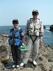 | ↑30日 久々のJパパとシュウ。海も凪で天気も良くて、そしてこの日唯一の形物は、やはりシュウ君が上げましたからね。いやいやその集中力に脱帽ですよ。シュウはカッコいいねぇ |