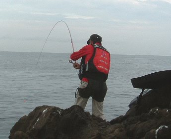すこぶる潮通しの良いところ、そして必ずと言っていいほど、良型イサキも出るという良い磯である・・・が、我々の狙いはメジナ^^ 撒き餌を撒くや否や、1投目から都築氏がイサキを掛ける。しばしイサキの入れ食い状態が続いたが、磯割り3番くじの私には、足裏サイズのオナガばかり・・・・^^