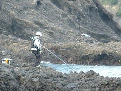 今日の目的はこの秘境のポイントを開拓し特徴を把握すること。満潮の磯を一通り探検する。ここは黒鯛の魚影も濃いところなので、まずは丹羽ウキBにG2+G4のガン球で竿1本で仕掛けをセット。最初は一番南向き先端を狙いたい。ポイント名は『石取向かい』と勝手にネーミングする。ところが凄いウネリでいきなり頭から波を被る。そそくさと退散。次は、そこから20b程北側のチャカ場で竿を出す。が、下りの潮で磯際にぶっつけて来る。足元は深くオーバーハングしていて、面白そうだが釣りづらいので、再度そそくさと退散。次は地磯向かいの水道に移動。沖に仕掛けがぐいぐい流れていくが、ここにも凄いウネリが来る。この沖にはかなり大きな隠れ根があって、ウネリが来ると波が盛り上がって恐ろしい。そこからきっかり10秒後に波が押し寄せてくる。ウキを見ているより沖の波を見ている時間が長く落ち着いて釣りができない。バッカンが波でひっくり返った。波のタイミングを見て、バッカンと玉網を高場に移動させるのも骨が折れるので三度そそくさと退散する(笑)。