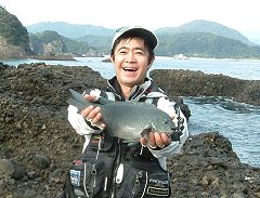 とにかく今日は磯の特徴を掴むことがメインなので移動が激しく、運動量が地磯のそれと変わらない。釣れなくてもそれだけで楽しいのですよ。目的があるってコトは大切です。1時を回ったあたりで、潮が引いて来たので波も被らなくなり午前中よりは釣り場の選択肢が増えている。が最後の3時間を『サビキ場』でじっくり粘ってみることにした。ここは地磯との水道。この水道の沖磯側に10b位の小根があるため普段は攻められないポイント。この小根とこことの水道周辺を釣る。口太・尾長交じりで段々サイズアップしてきたが玉網はまだ必要なし。唐突だが今日始めての太陽が現れた。お天道様に感謝の気持ちでコマセをドカドカ撒いて、随分潮下に仕掛けを投入。一杯だけウキにコマセを被せた。時間はきっかり2時。ヨレに入ってシモッテ行くウキが加速して消しこんだ。本日初の玉網サイズは上出来の口太42センチ。何か今日は自分でも頑張ってるな〜と思ってたところだったので(笑)チョー嬉しい。一匹釣れたらもうそれで満足。気分的にはもう今日の釣りは終了。残りの時間はブラブラして迎えの船を待った。今日は天候の変わり目で大きい魚が喰う日でした。