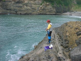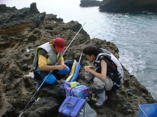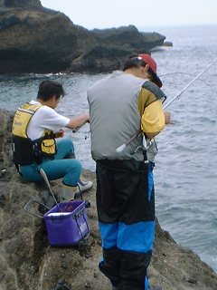 左はガイドそっちのけで 釣るオジン金田と そ知らぬ顔で仕掛けに 夢中の別府さん。 右はサラシを攻める 萩田ガイドだが