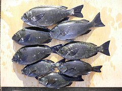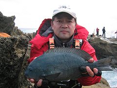 11時半すぎにシモらせているウキが完全に見えなくなったので合わせるとすごい引き。メジナと確信し、イトを出さずにやりとりして無事タモイン。計測すると41センチ(後の計量で40.8)。約1年ぶりの大台でとても嬉しい。その後の1時間ぐらいに30前後が2枚と35−37が4枚とほぼ爆釣。仕掛けを教えて隣で竿を出していた中山君も40センチをゲット。終わってみれば本命(メジナ)ではサイズ的には一番の釣果になりました。