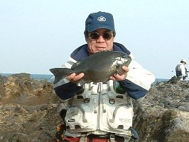 そのやり取りの後半は、彼が私の竿を握って、私がタモ入れをした。それはでっぷりとパンパンのお腹をした42cmのクチブトメジナであった。