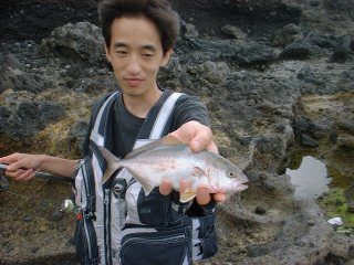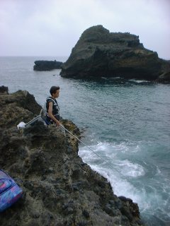 結局、この時は大きいのは出なかったが、3人とも苦しい状況の中、そこそこの釣果をあげているようでした。さて、夕釣りであるが、自分もこの時間に狙いを絞っていたので、コマセは何故か、昼よりかなり多めである。状況はわかっていたので、気が強いものである。(笑)最初から、サラシの多いところは攻めずに、その脇で竿を出すことにした。まずは磯際のサラシの吸い込むところに完全フカセで流し込んでいく。しかし・・サシエは取られるのだが針掛かりしない。これではダメだろうと、次はガン球を段打ちにして、まず、サシエをなじませてからマキエを撃つ。しばらくすると、横で金田さんが声をあげている。うわ〜〜!って糸を出しているじゃないですか!もう、自分の釣りどころじゃなく、見に行くと、竿の感じからみた感じでは40クラスの魚のようだ。しかし、やつはギューンと磯際に突っ込んでいく。3分くらいやり取りしただろうか?あえなくバラシ。俄然、やる気が出てきて、磯際などをせめていると、30弱のメジナが釣れてきた。しっかし、この時期の魚は元気だ。一瞬もっと大きいかと思った。その後、カワハギなどを釣っていると、また変なのが来た。(笑)今度はフエフキダイのようだ。ほんとに今日は珍しい魚がくる。(笑) |