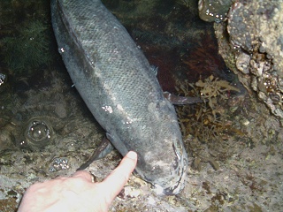 とにかくメタボなので、プールで遊んでもらった。とっぷり暮れてアタリも無いので、しばしイス君と遊んでみた。最初は人気を感じて逃げるのだが、ライトを当てていても、私がじっとしゃがんでいるとまた浮いて来る。これだけの大型になると愛着も湧くものだ。イス君曰く「逃げようにもこんなに狭いとジャンプも出来ない」・・・「そか、じゃ頭でも撫ぜてやろうか」・・・「好きなようにせぇや」 そんな感じでこの魚とコミュニケーションをとったつもり(笑)なのだが ここにもし小さい人の子がいたら、なんて思うだろう?「魚って、こんなにおとなしいの?」と思うに違いないほど、このイス君は開き直っている。 夜のせいだろうか、それとも諦めが肝心と悟ったのだろうか・・・・ 結局この魚の顔を覗き込むほどに食う気は失せてきた。やはり海へお帰り頂くことにした。「また俺の針に食ってきてもエエよ」と言うと「そうは問屋が卸しまへん」とばかりに、ゆっくりと深みへと泳いでいった。