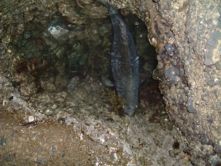 このイス君にしばらくタイドプールで休んでいただいた。伊豆の地元でもイスズミはほとんど食べないみたいだが、港で網に掛かった大型のイスズミを女性陣が綺麗に身だけ剥いでいたのも知っている。八丈島ではメジナより喜ばれる魚なのだ・・・・が^^