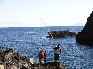 この人と私は昨年の夏から殆ど釣りに同行している。別に怪しい関係ではないのだが、彼は本当に釣り好きか、暇かである。元々川で鯉等の大物を狙っていた経験がありタックルの扱いには慣れていたため、彼の磯デビューは明るいうちに釣り始め、慣れたところで夜釣りをする予定であった。しかしそこは夏の伊豆、大渋滞で到着が遅れ完全な夜がデビュー戦となってしまった。初の獲物はアジやサバであったが何れも30cmオーバーであり、かなりの刺激であったようだ。その2週間後の釣行の際、Y氏は立派な磯釣りおじさんに変貌を遂げていた。何とヒップガードまで揃えていたのである。私と釣行しない時は、友人や家族を連れて堤防めぐりをしているらしく、ゴロタの夜釣りまで経験済みで42cmのメジナまで上げている。釣果も道具も既に私の上を行っており腕もセンスも良い。恐らく彼の近所の釣具屋でYさんと言えば知らない人がいない程であろう。