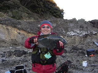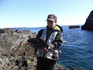 12:30頃シュウの竿が再び大きく曲がるが手前に潜られ、ばらしてしまった。40cmオーバーのメジナに違いない。更に16:00頃Y氏が41cmのメジナを上げる。これまたうれしそうな彼を記念撮影。何れも足元がポイント、1.5号ハリスである。