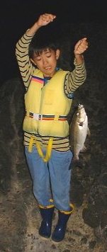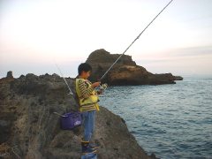 次々と20cm前後のメジナを掛け、両手で竿を持って引き抜く。ウキが沈まないうちは無表情だが、一旦針掛かりして、魚が浮くと表情が一変する。本当に嬉しそうな子供の表情だ。10匹程のメジナを上げただろうか、小さくても引きのいいメジナだけに息子は手首が痛いと言い出した。竿は1.2号のインナーなのでしばらく休憩。すでに日は沈み、薄明かりの中、私がイサキを掛けた。なかなかの良型である。息子に掛けさせたかったがこれも順番というものか、これっきりで終わってしまった。