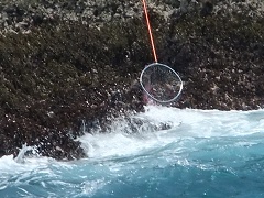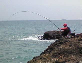 磯の根元の安全な場所まで波が這い上がるので、二人で竿を出せないでいたのだが、少しずつ潮も下がってきたころあいを見計らっていざ。