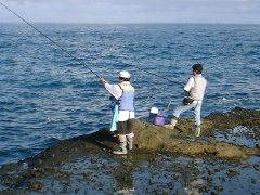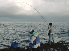 小沢さんと長野さんに竿を出して頂いたのだが今回は初めての方が2人いらっしゃるので、磯へ入る前に約40分ほど近くの港で講習会を持ってからの実釣でした。その甲斐あってか2人とも1投目でいきなり竿を曲げる好調ぶり。やり取りから魚の抜き上げ方も、港での講習を忠実に実践、なかなか皆さん筋がよさそうである。
