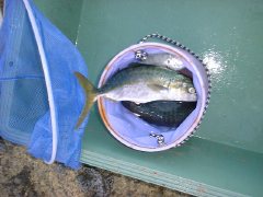 すでにこの磯には先客2名がいたので、挨拶をして状況を聞くとあまり芳しくないようである。しかし我々が準備している間になにか青物らしきやり取りが始まった。大型のサバかと思いきや40cm弱のワカシ(ブリの子)であった。ちょうど仕掛けを撒き戻しにかかった直後に来たということである。嬉しい外道で、釣ったご本人もご満足そうでした。