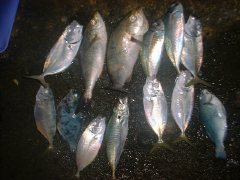 その後別府さんもなぜか遅れて参加。3人揃ってシマアジの子やまずまずのアジ、それに小メジナを交えて順調に釣り上げる。小沢さんと長野さんは2号竿、別府さんは自前の1.5号インナー竿でした。