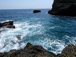 画面左の低い離れ磯から、ウネリによる大サラシが、左から右方向へ出る。下りの流れとぶつかる。