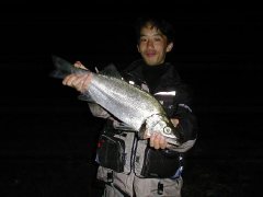 さて我々2名の内1名は船釣りに精通している方で、いきなりカットウ釣りで磯を攻めます。水深6メートルを探るのはあまりにも浅すぎるようですが、少し投げて底へ着底するまでにさびいたり落としたりを繰り返し、なんと50cmクラスのマゴチを上げました。(写真上右)本命ではないのですが嬉しい外道です。砂地交じりの磯ならでわの獲物で、今はヒラメも狙える季節です。この日はルアーの方も数人いらっしゃいましたが、生餌のカットウに分があったようですね。