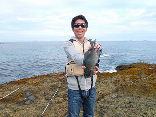 ポツポツと足裏サイズのメジナを掛けていただく中で、Oさんに良型のイサキが来た。