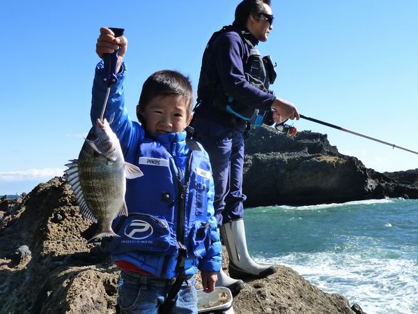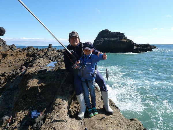 10月に西伊豆の堤防で偶然出会った親子と、今度は磯釣り入門教室で磯へお誘いした。