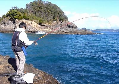 ということで夕間詰めは足元の際を狙って・・・スパっと入ったウキだったが、サミングが甘く少し糸を出してしまったがために根に潜られてしまった。想像するにそれは良型のメジナ。