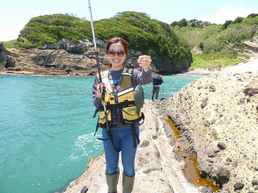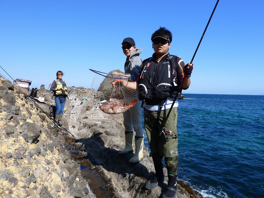 あやさんも負けじと釣っていた。 このお二人は、ある堤防で偶然知り合ったお二人で、後日磯釣り入門教室に 申し込んでいただいた二人。 とても気さくで好奇心旺盛な二人で、我々も天気の良い1日を楽しませていただいた。