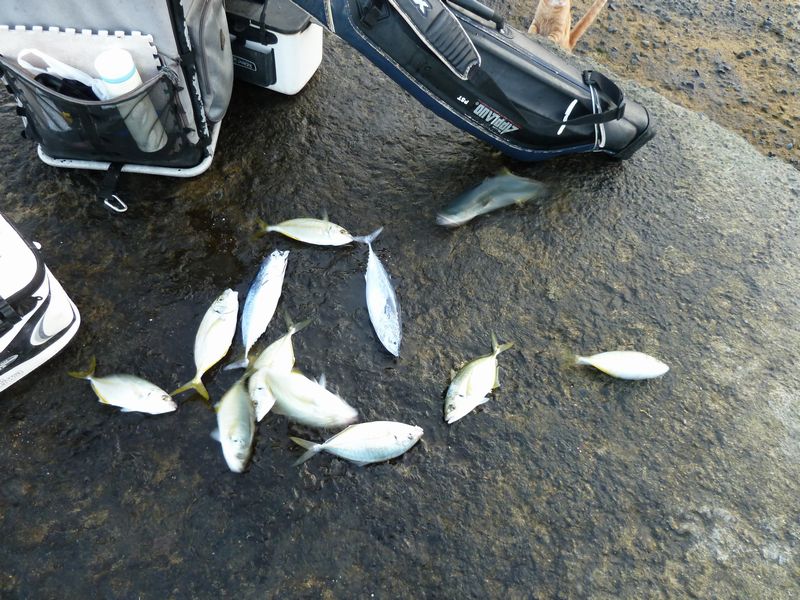 足元にには木っ端メジナがいっぱい・・・・ その中にも30pクラスのメジナも混じる。 それを狙うより、他魚を二人で探ってみた。 やはり撒き餌の効果は大きかった。 そんなに経たない時間でシマアジ・丸ソーダカツオそして良型のイナダまで来た。