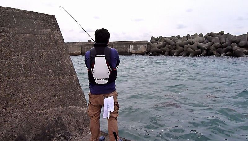 9/29 磯釣り教室 東寄りの風が強く堤防へ。 曲がっている竿の先にはクロダイ。
