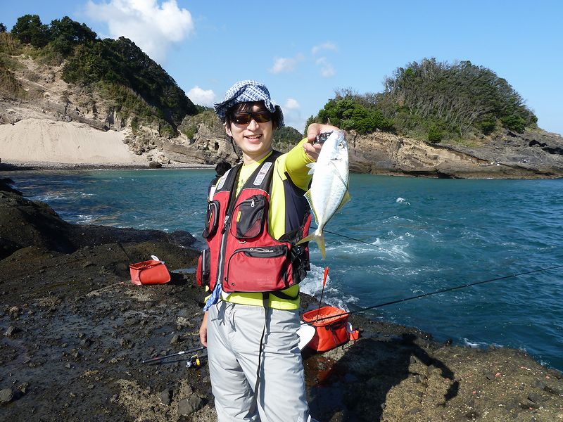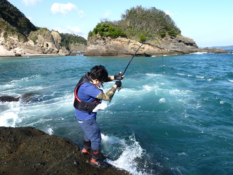 磯釣り入門教室に4度目のご参加のkenさん、この日も前回の堤防同様に、幾度となく大きく竿を曲げていた。青物のシマアジだが時合いのみならず4時間ほどの間に回ってきていた。それもまた堤防とは違って幅広い時間ならでわの回遊だろうか。