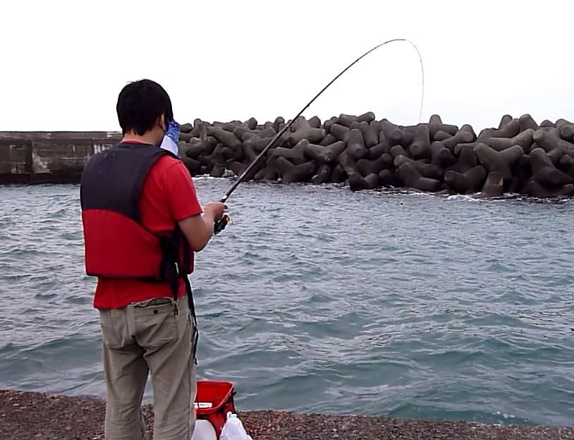 この日も強風により波が高く磯へ入れず堤防へ。 だが堤防であっても、魚の掛け方、そしてそれを浮かせるやり取りなどなど いろんな体感ができてとても有効なのです。 磯釣り教室へ7月以降すでに4度目のご参加の独身kenさんだが・・・