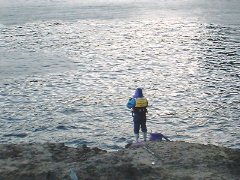 カゴ釣りの彼も我々より1時間ほど早く釣っていたが芳しくない。こちらもこの場所を諦め、南向きへと移動。そこは大きなワンドの入り口なので仕掛けを留めやすい。風もなんとか耐えられそうなのだが、潮が動かない。