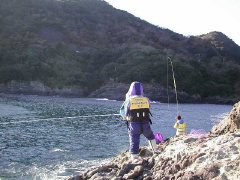 さて釣りはというとこの時期にしては餌取りが異常に多い。カサゴ類が一発目の撒き餌に競い合って水面まで食いあがってくる。魚影が濃いといえばそうなのだが、我々の狙いはメジナで対処の仕方を考える。数回仕掛けを入れてみるがサラシと風の影響で道糸をうまくコントロールできない。そうこうしているうちに息子の道糸が手前の根にからみウキを流出してしまった。回収不能となってしまったウキだが先客のカゴ釣りのお兄さんが拾えそうとウキを竿で留めてくださり無事回収。同じ釣り師として親切でありがたいひとコマであるが、息子も声こそ出さないまでも気持ちは伝わったであろうことを信じる。
