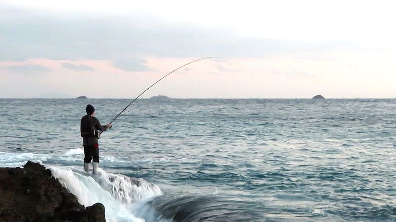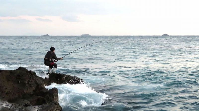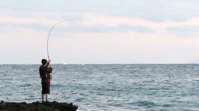 風も収まって潮も下げてきた夕間詰・・・これは来たか!! 3連の画像は動画のキャプチャだが、なかなかスリリングなものだった。 やや太仕掛けでヒットした大物だが、竿を立てるにも立てられない。 その間も猛スピードで走るので糸を出さざるをえない。 そして左へ一機に走ったので釣り座も移動して・・・・ さて獲物は何だったか、皆さん想像してください^^ ヒントは面積の広い魚でした。 レポート 金田